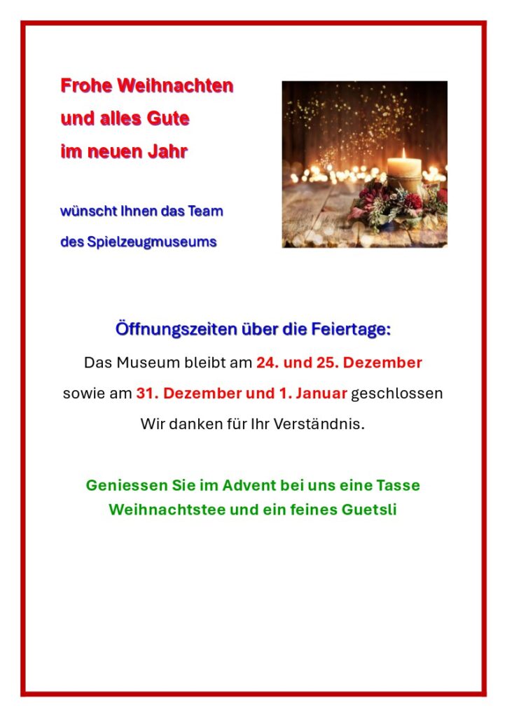 Öffnungszeiten über die Feiertage Das Museum bleibt am 24. und 25. Dezember sowie am 31. Dezember und 1. Januar geschlossen.